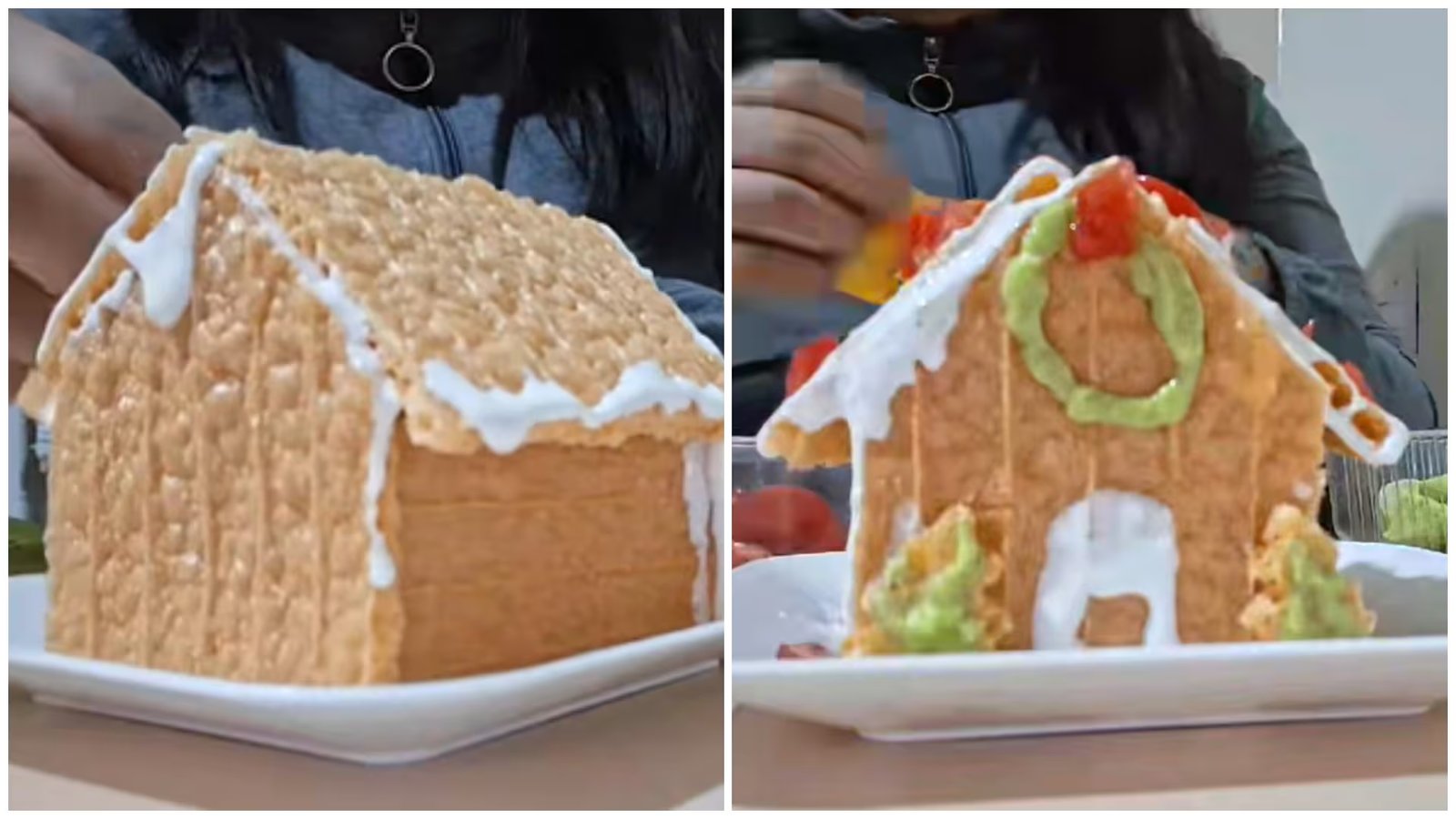En la grabación se observa el proceso de armado: la creadora acomoda en la mesa los elementos clásicos del antojo callejero (chicharrón, crema, lechuga, limón y distintos acompañamientos) y comienza a ensamblar cada pieza con cuidado hasta dar forma a una pequeña vivienda decorada con detalles propios de la temporada decembrina, sin perder el toque tradicional del popular snack.